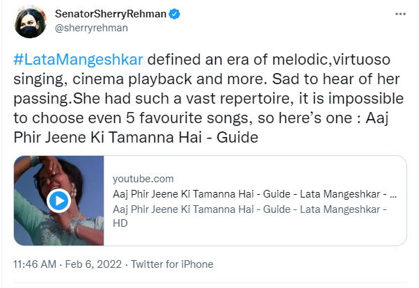 Senator Sherry Rehman wrote, “Lata Mangeshkar defined an era of melodic, virtuoso singing, cinema playback and more. Sad to hear of her passing. She had such a vast repertoire, it is impossible to choose even 5 favourite songs, so here’s one: Aaj Phir Jeene Ki Tamanna Hai – Guide.”