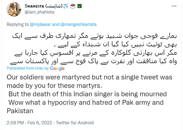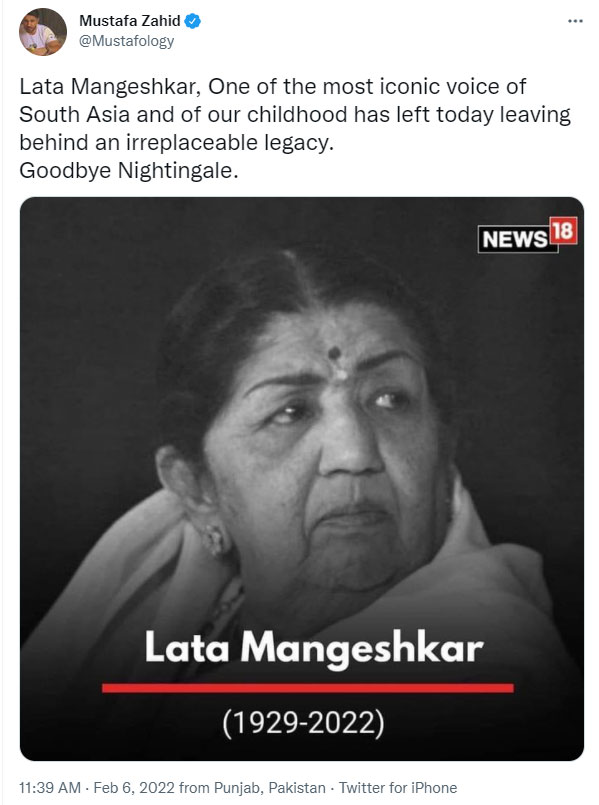 Pakistani musician Mustafa Zahid said, “Lata Mangeshkar, One of the most iconic voice of South Asia and of our childhood, has left today, leaving behind an irreplaceable legacy. Goodbye Nightingale.”