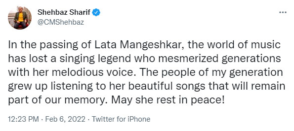 Leader of Opposition, Shebhaz Sharif said, “In the passing of Lata Mangeshkar, the world of music has lost a singing legend who mesmerized generations with her melodious voice. The people of my generation grew up listening to her beautiful songs that will remain part of our memory. May she rest in peace!”