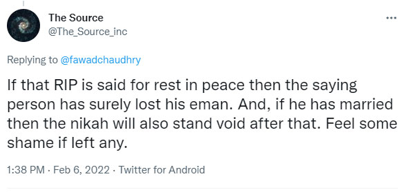 Twitter user The_Source_inc said, “If that RIP is said for rest in peace then the saying person has surely lost his eman. And, if he has married then the nikah will also stand void after that. Feel some shame if left any.”
