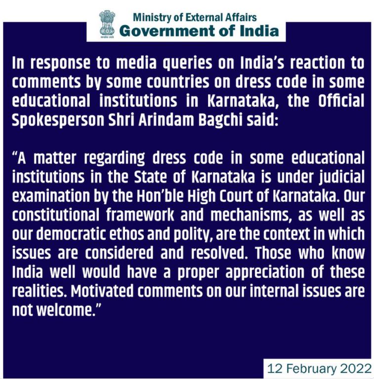 Our response to media queries on India’s reaction to comments by some countries on dress code in some educational institutions in Karnataka:https://t.co/Mrqa0M8fVr pic.twitter.com/pJlGmw82Kp