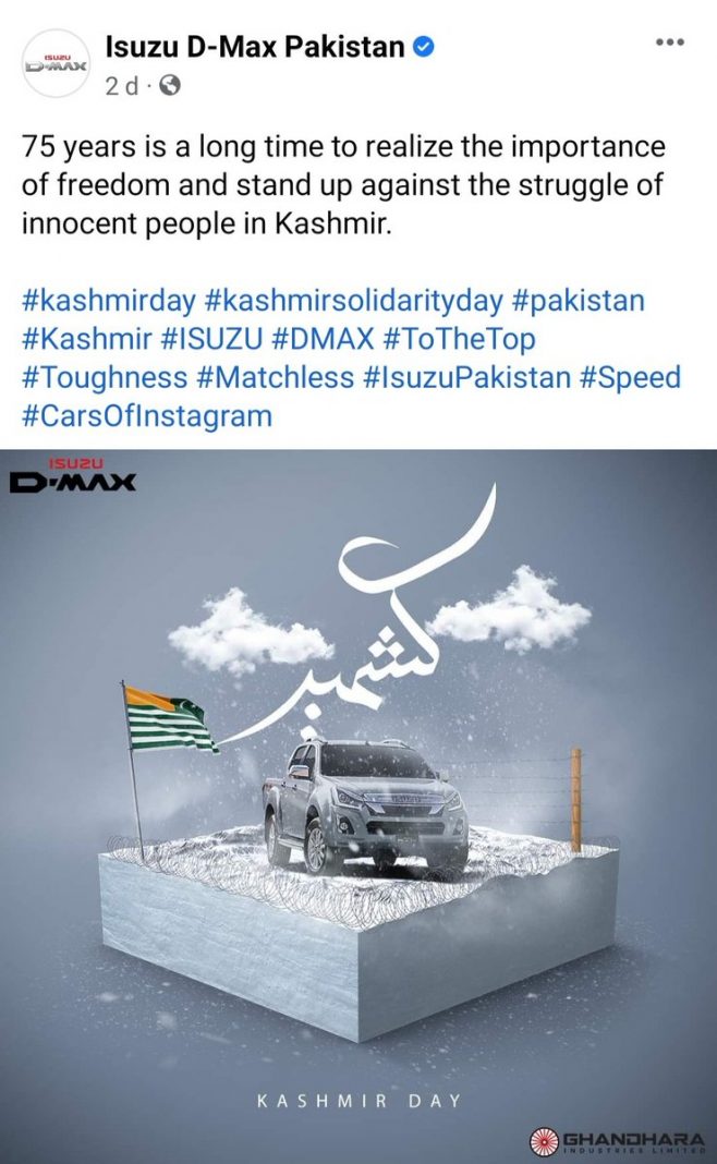The Pakistani dealership of Japanese vehicle manufacturer Isuzu also called for the secession of Jammu and Kashmir. “75 years is a long time to realise the importance of freedom and stand up against the struggle of innocent people in Kashmir,” it posted on Facebook.