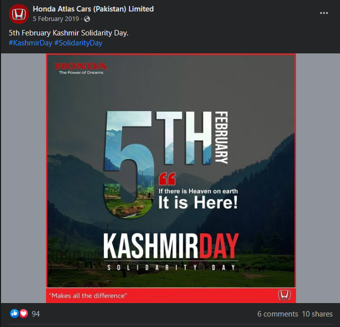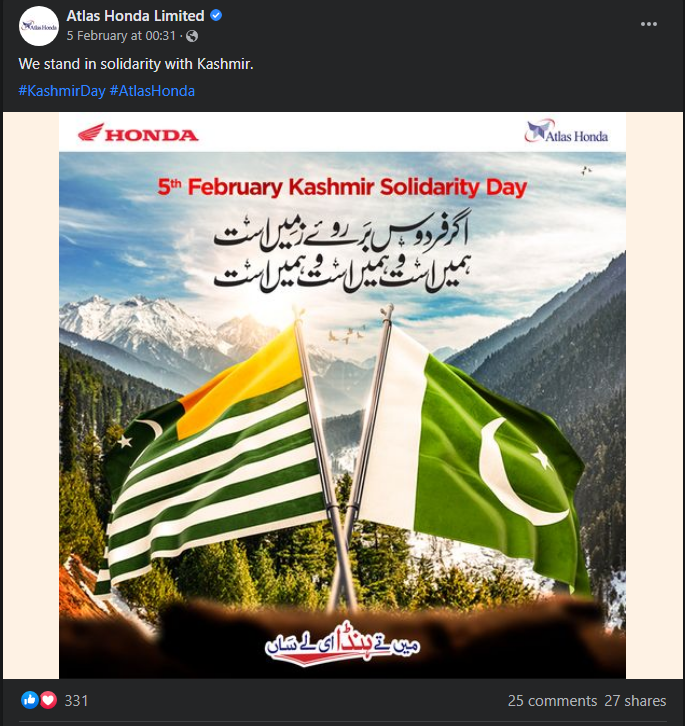 On February 5 this year, Atlas Honda Limited posted on Facebook, “We stand in solidarity with Kashmir.”