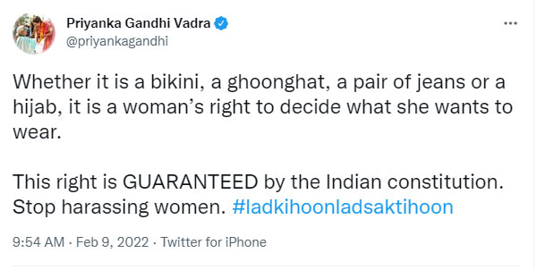 On Wednesday morning, Congress leader Priyanka Gandhi posted a tweet in which she said women have the right to wear whatever she wants. The tweet was linked to the hijab controversy that has been happening in Karnataka, where a few Muslim girls demanded they should be allowed to wear hijab in classrooms.