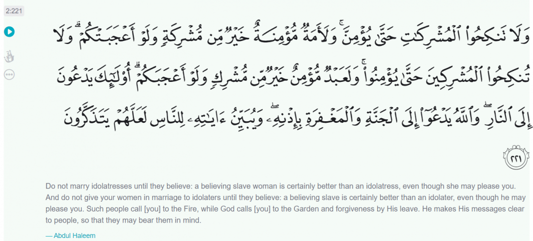 Here, it is advised that a slave who is a Muslim can be married but any non-believer cannot be married until one converts to Islam. “Do not marry idolatresses until they believe: a believing slave woman is certainly better than an idolatress, even though she may please you. And do not give your women in marriage to idolaters until they believe: a believing slave is certainly better than an idolater, even though he may please you.” reads the verse.
