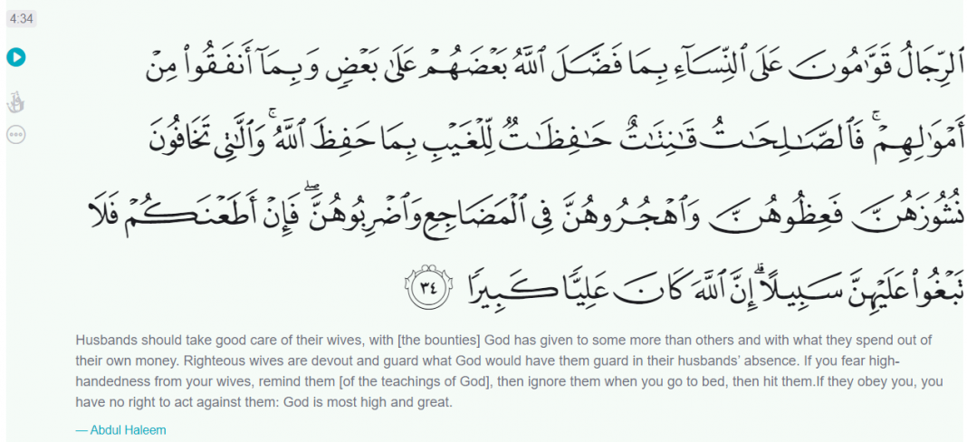 “If you fear high-handedness from your wives, remind them [of the teachings of God], then ignore them when you go to bed, then hit them. If they obey you, you have no right to act against them: God is most high and great.” reads this verse advising Muslim men to hit the wife in case they don’t agree with them.