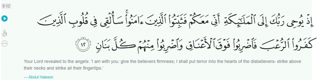 This verse, which comes under Al-Anfal chapter of the Quran, states that disbelievers (non-Muslims) are to be beheaded and their fingers chopped off. “Your Lord revealed to the angels: ‘I am with you: give the believers firmness; I shall put terror into the hearts of the disbelievers- strike above their necks and strike all their fingertips.’ reads the mentioned verse.