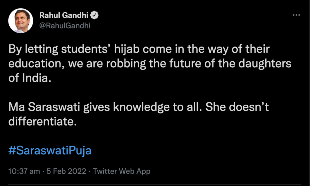 Gandhi-scion and Congress leader Rahul Gandhi took to Twitter on Saturday to share wishes on the occasion of Saraswati Puja. However, even while wishing for a festival, he could not fail to keep his politics out of it. For him, the Saraswati Puja was an occasion to shame ‘Hindus’ because some Muslim women in Karnataka are preferring hijabs over their education.