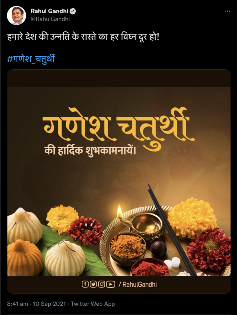 If one looks at his tweets, one can notice that Rahul Gandhi avoids sharing any graphics or images of Hindu deities as he wishes Hindus impassively during festivals. Moreover, the tweet has no images of Maa Saraswati, hinting at the conscious attempt of not including any Hindu iconography in his tweets.