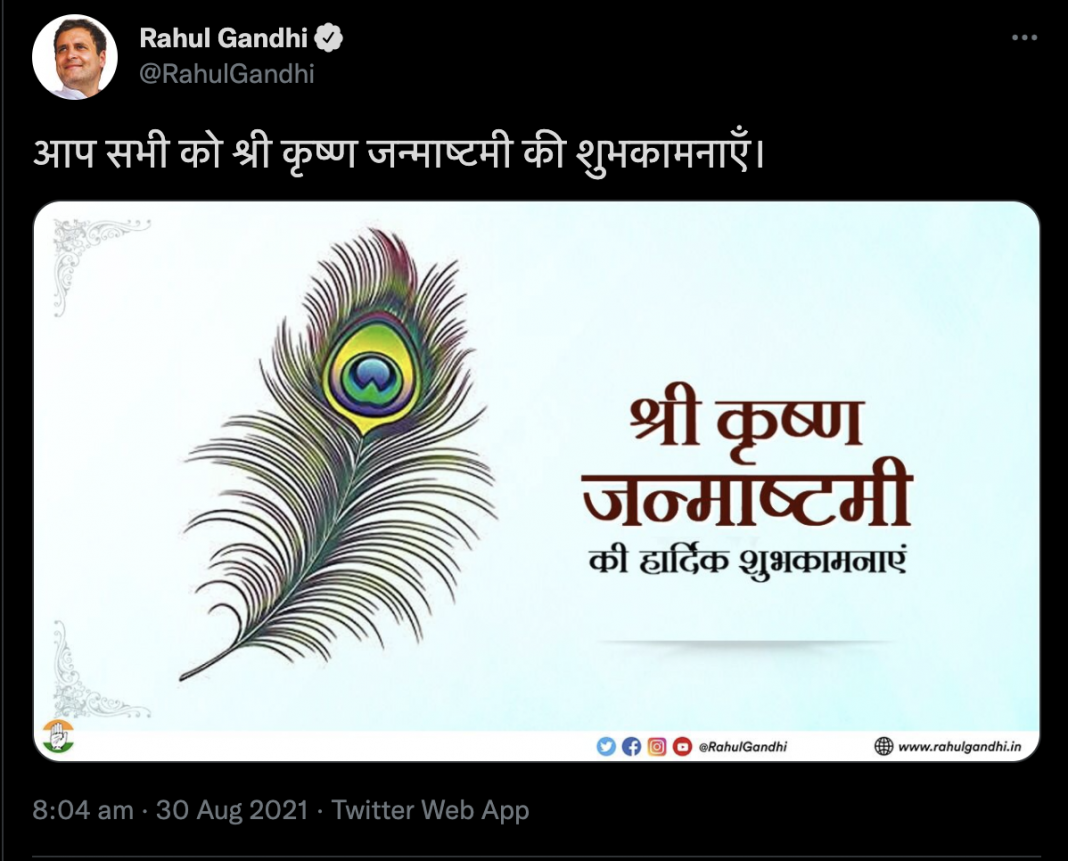 In another instance, Rahul Gandhi had wished Hindus on the occasion of Shri Krishna Janmasthami. However, he had deliberately left the image of Lord Krishna from his tweet.