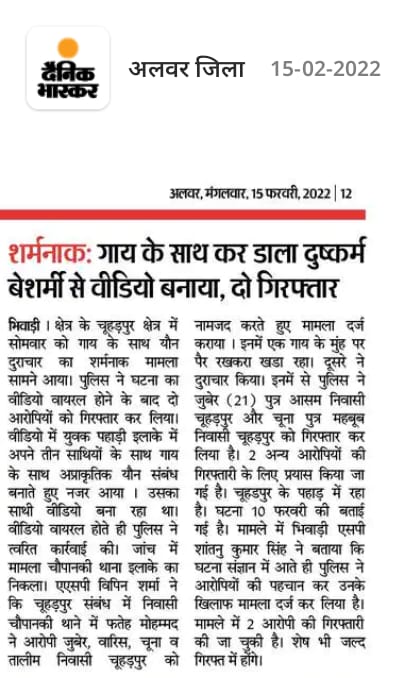 The incident was reported in Dainik Bhaskar. It occurred in the Alwar district’s Choupanki police station area. A police complaint was filed against four Chuhadpur residents, Waris, Zubair, Chuna, and Taleem. Zubair and Chuna have been arrested and the police are looking for the other two culprits in the case.
