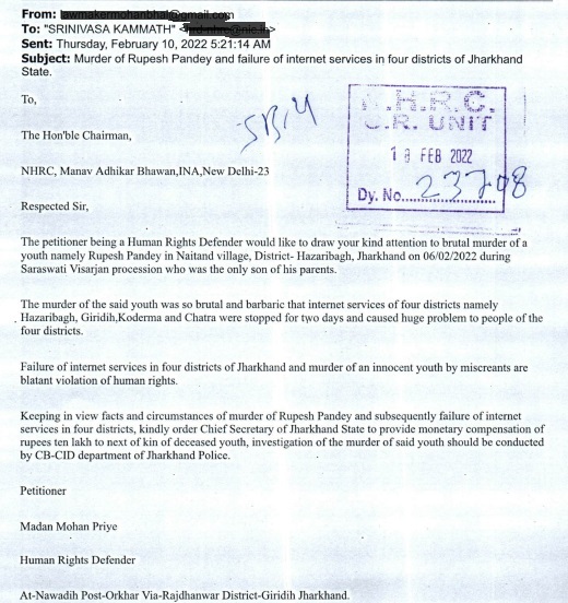 The National Human Rights Commission (NHRC) of India took cognisance of the brutal murder based on a complaint it received dated February 10, 2022, from one Madan Mohan Priye. In the complaint he detailed the brutality inflicted on the murdered 17-year-old boy on the night of February 6, 2022. He demanded a monetary compensation of Rs 10 lakhs for the kins of the deceased as well as a fair and prompt probe by the CB-CID department of Jharkhand police.