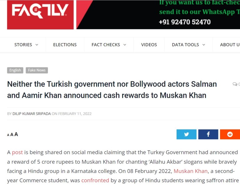 Similarly, koimoi.com has also rejected this claim of actors rewarding her money. Another claim that the Turkish government is awarding the protestor in Karnataka are also unverified.