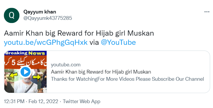 Another user named Qayyum Khan (@Qayyumk43775285) shared a link to a video posted by a YouTube channel named Pakhtunkhwa Channel and wrote a tweet stating that Aamir khan has rewarded Muskan Khan.
