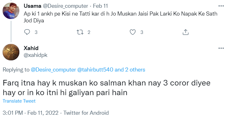 A similar ruse was posted by a user named Kashmir Today (@KashmirToday085), who claimed that the actor had paid Muskan Khan Rs 3 crore.