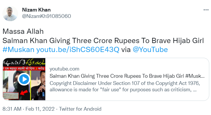 Nizam Khan, another user, made a similar assertion. In his tweet, he stated that Salman Khan gave Muskan Khan five crore rupees. The individual also uploaded a link to the ‘Kahani Centre’ YouTube channel, which made similar claims. It has around 7 lakh subscribers as well. While commenting on the video, Islamists have expressed their support for Muskan Khan.