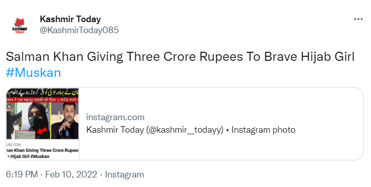 According to a Pakistani Twitter user called Zahid (@Xahidpk), Salman Khan gave Rs 3 crore to hijab girl Muskan Khan.