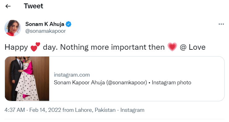 Sonam Kapoor tweeted “Happy ? day. Nothing more important then ? @ Love” and tagged a post of Instagram. The tweet was made from Lahore, Pakistan at 04:37 AM on February 14th.