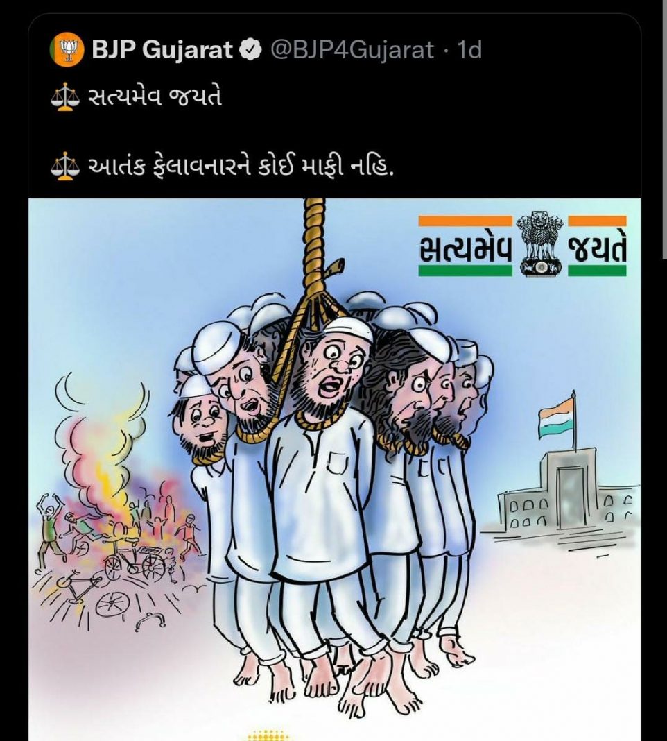 BJP Gujarat had shared an image which showed the representative caricature of the terrorists hanging to death, symbolising that terrorists will meet their rightful end.