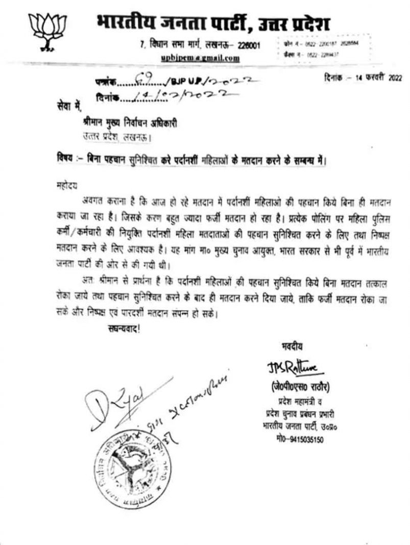 The BJP has accused polling booths of facilitating fake voting by burqa-clad women and has requested that the identities of burqa-clad women be thoroughly vetted by female police constables. The party also requested that women constables be stationed at all polling stations to monitor the voting process. The letter signed by UP BJP’s general secretary JPS Rathore urged the EC to stop the elections till arrangements are made for verifying the identity of women in veils.