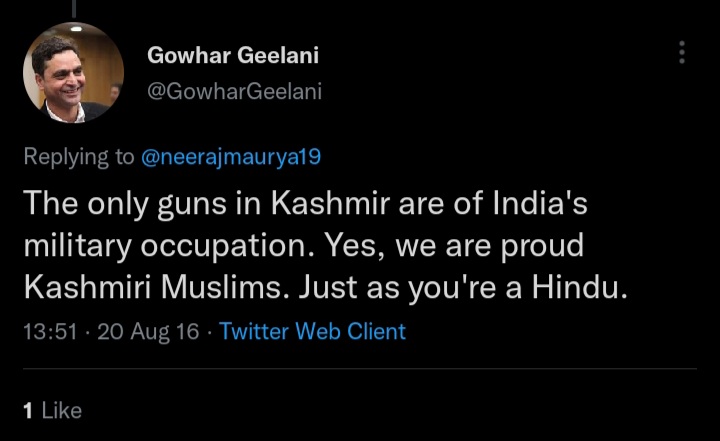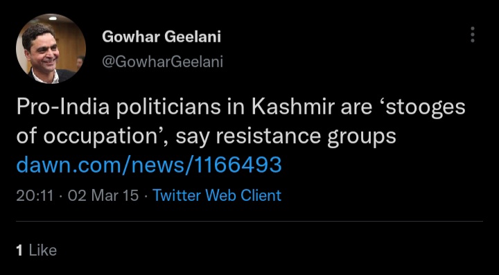 On 02 March 2015, he tweeted, “Pro-India politicians in Kashmir are ‘stooges of occupation’, say resistance groups”