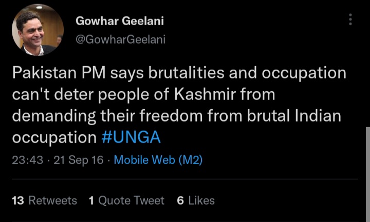 Another tweet made on 21 September 2016 reads, “Pakistan PM says brutalities and occupation can’t deter people of Kashmir from demanding their freedom from brutal Indian occupation #UNGA”