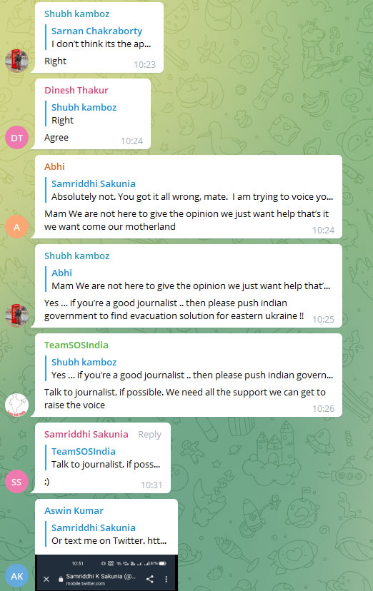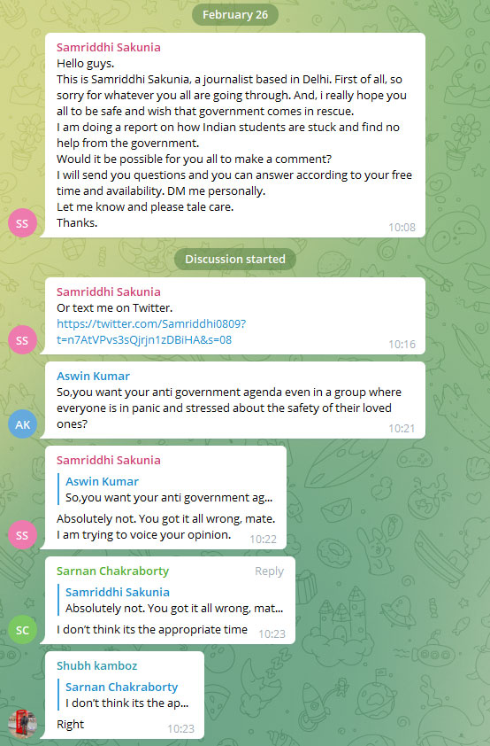 Several users on the Telegram group joined Aswin Kumar and reprimanded Samriddhi K Sakunia for using the plight of the distressed students as a political opportuntuy. “I don’t think it’s the approproiate time,” wrote one Sarnan Chakraborty.