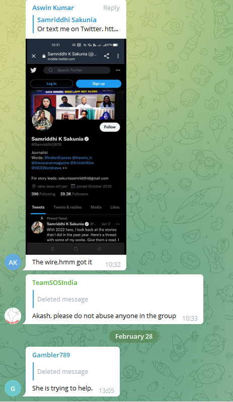 Interstingly, the admin of the Team SOS India Telegram group quickly came out in defence of Samriddhi K Sakunia. It posted, “Talk to journalist, if possible. We need all the support we can get to raise the voice.” Aswin Kumar pointed out that the ‘journalist’ had worked leftist propaganda news portal such as The Wire.