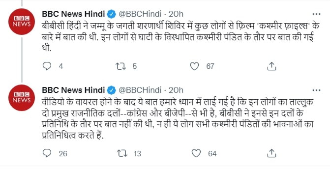 BBC further added, “After the video went viral, it has been brought to our notice that these people also belong to two major political parties, Congress and BJP. The BBC did not speak to them as representatives of their respective parties. They do not represent the sentiments of all Kashmiri Pandits.”
