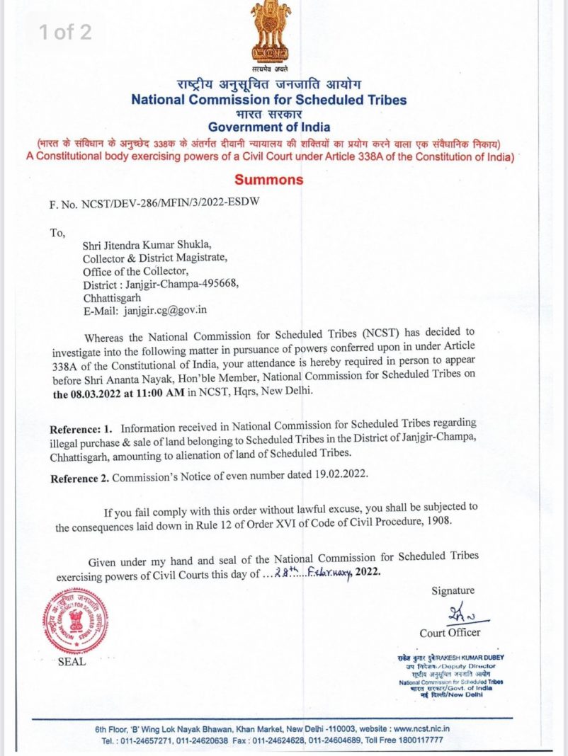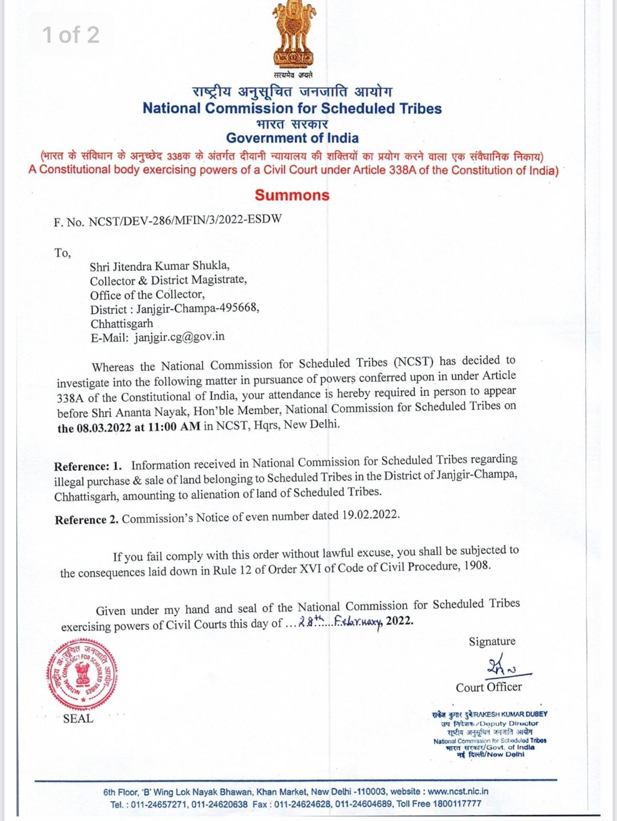 The national commission for scheduled tribes received a complaint regarding this. The commission then issued a notice to the revenue secretary of the Chhattisgarh state and the managing director of the Chhattisgarh State Industrial Development Corporation. None of them responded to the notice. The SP and DM of the Janjagir-Champa district were also given the same notice. But they did not satisfactorily respond to the commission. The commission has now summoned the SP and the DM of Janjagir-Champa district to be present on 8th March 2022 and furnish their explanation.