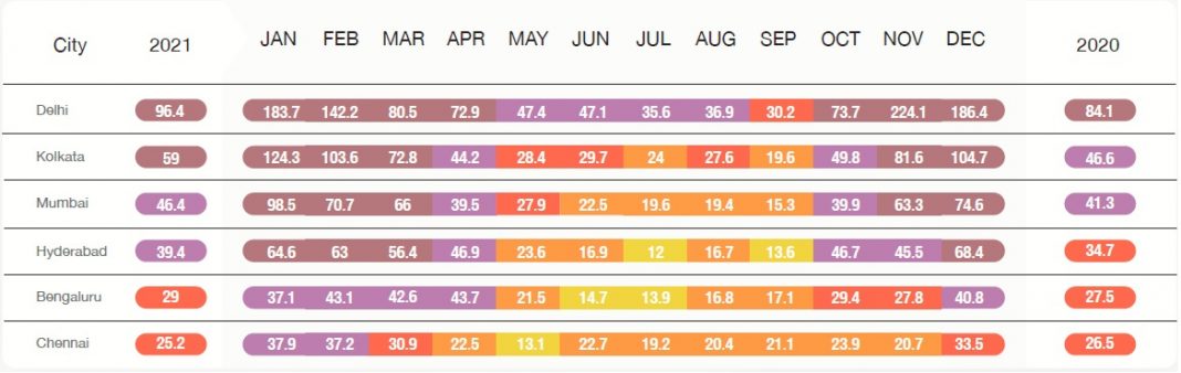 In 2021, Delhi continued to feature at the top in air pollution levels as compared to other metropolitan cities such as Kolkata (59 μg/m3), Mumbai (46.4 μg/m3), Hyderabad (39.4 μg/m3), Bengaluru (29 μg/m3) and Chennai (25.2 μg/m3).