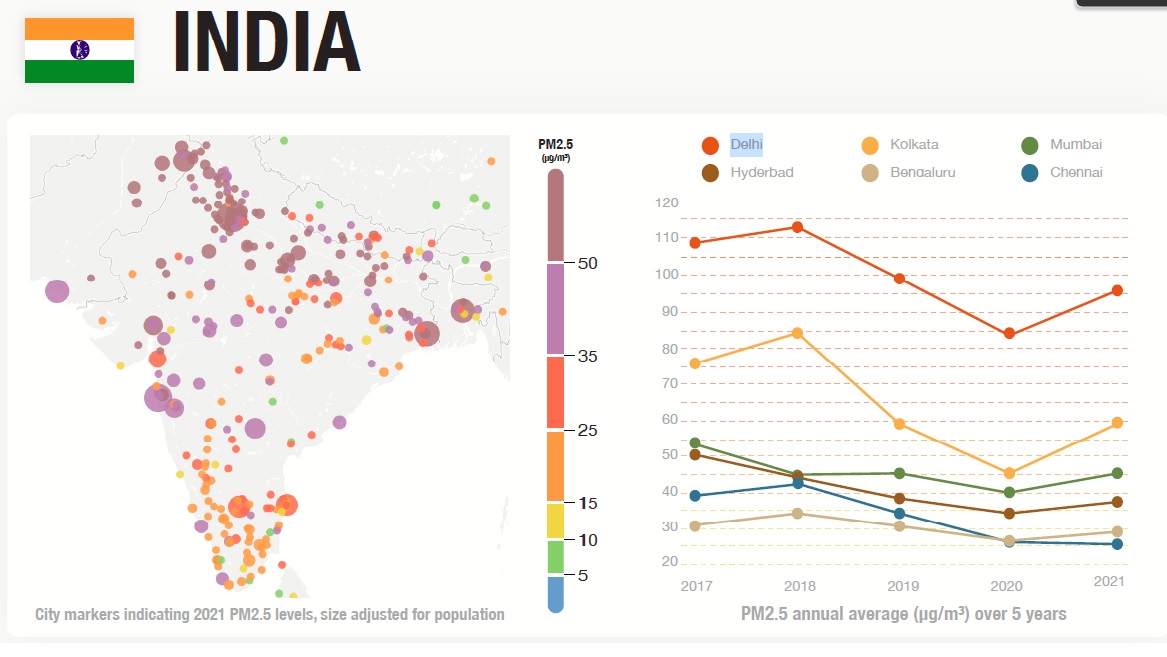 As per the IQAir report, no Indian city was able to meet the World Health Organisation’s air quality guideline of 5 μg/m3 in 2021. Reportedly, more than 50% of Indian cities had 10 times more PM2.5 levels than the WHO guideline.