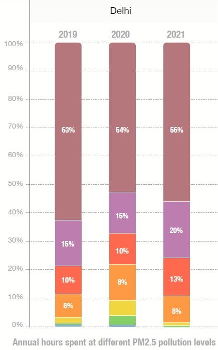 The air quality report pointed out that in 2021, India was home to 11 out of 15 most polluted cities in South and Central Asia. During that period, PM2.5 levels in Delhi increased from 84 μg/m to 96.4 μg/m3.