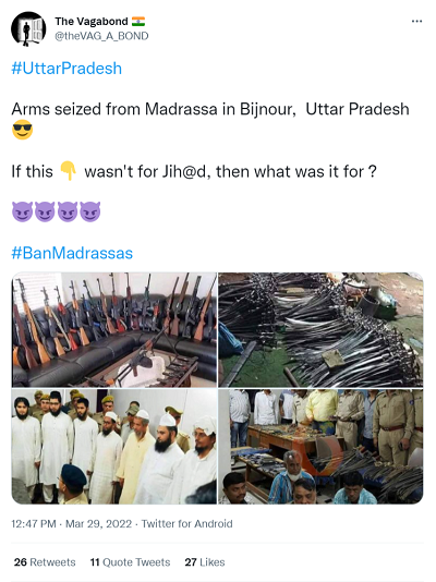 Similarly, others too joined in to spread the claim that a huge cache of arms has been seized in Bijnor. A Twitter user with the handle @theVAG_A_BOND posted a tweet insinuating that the swords were gathered for ‘jihad purpose’. “Arms seized from Madrassa in Bijnor, Uttar Pradesh. If this wasn’t for Jihad, then what was it for?”, the tweet read.