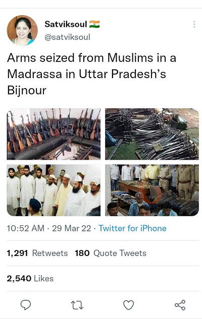 A Twitter user with the handle @satviksoul posted a tweet on March 29, 2022, claiming that the Bijnor Police had seized arms, guns, pistols and swords from a madrassa in Uttar Pradesh. The tweet instantly went viral, racking up more than 1,500 retweets.