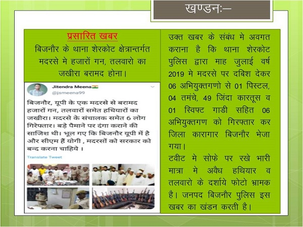 Social media platforms on Tuesday were awash with a post that alleged that thousands of swords and pistols have been seized from a madrassa in Uttar Pradesh’s Bijnor district alongside the arrest of six people.