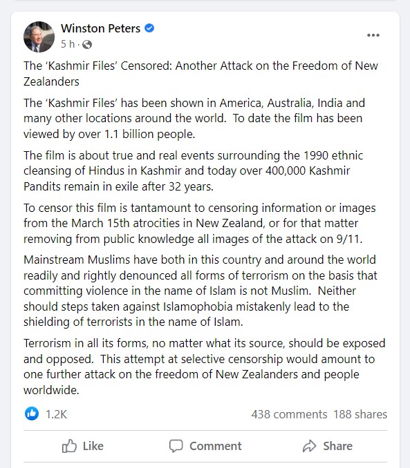 Winston Peters, who is leading the New Zealand First party since its inception in 1993, wrote, “The ‘Kashmir Files’ Censored: Another Attack on the Freedom of New Zealanders. The ‘Kashmir Files’ has been shown in America, Australia, India and many other locations around the world. To date the film has been viewed by over 1.1 billion people.”