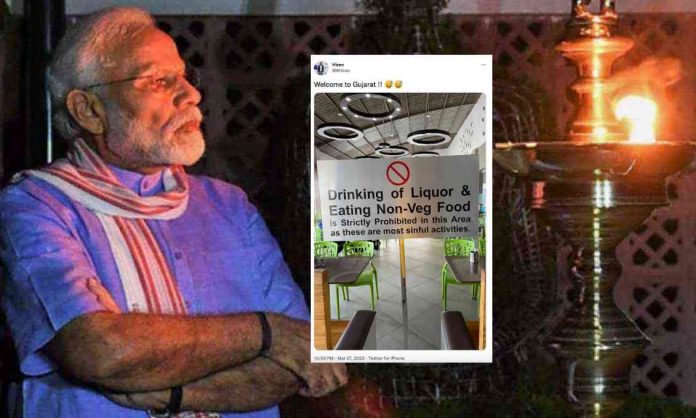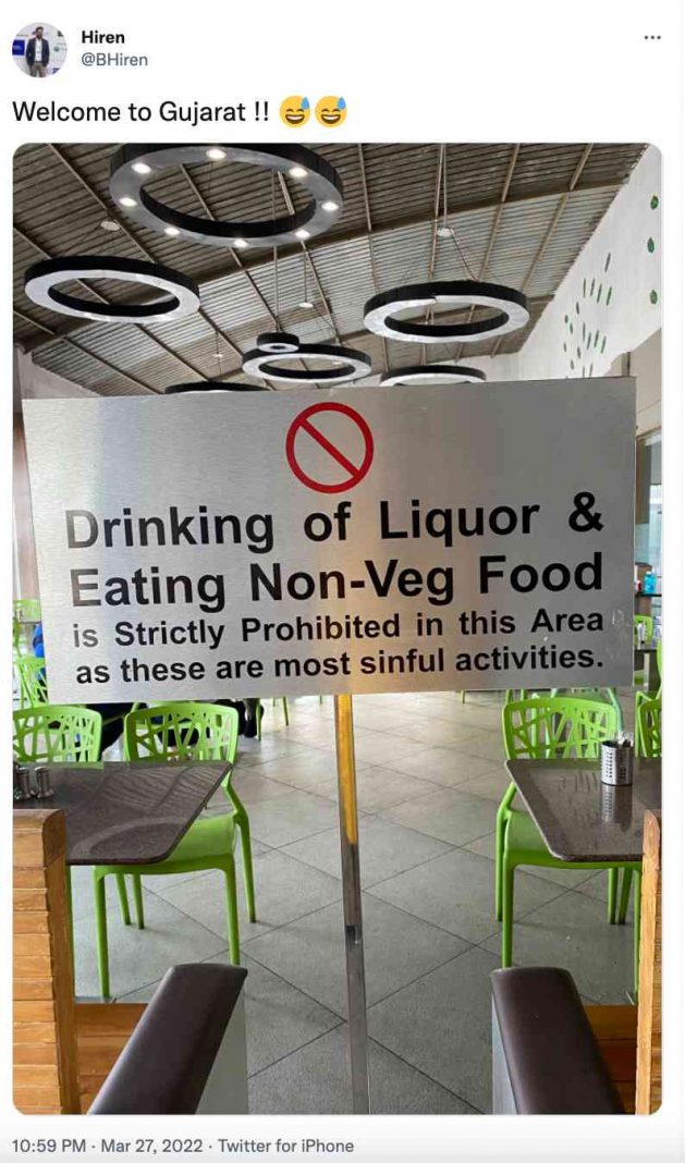 Twitter user Hiren on Sunday, March 27 shared an image from a restaurant in Gujarat with a board that said ‘Drinking of liquor and eating non-veg food is strictly prohibited in this area as these are most sinful activities’.
