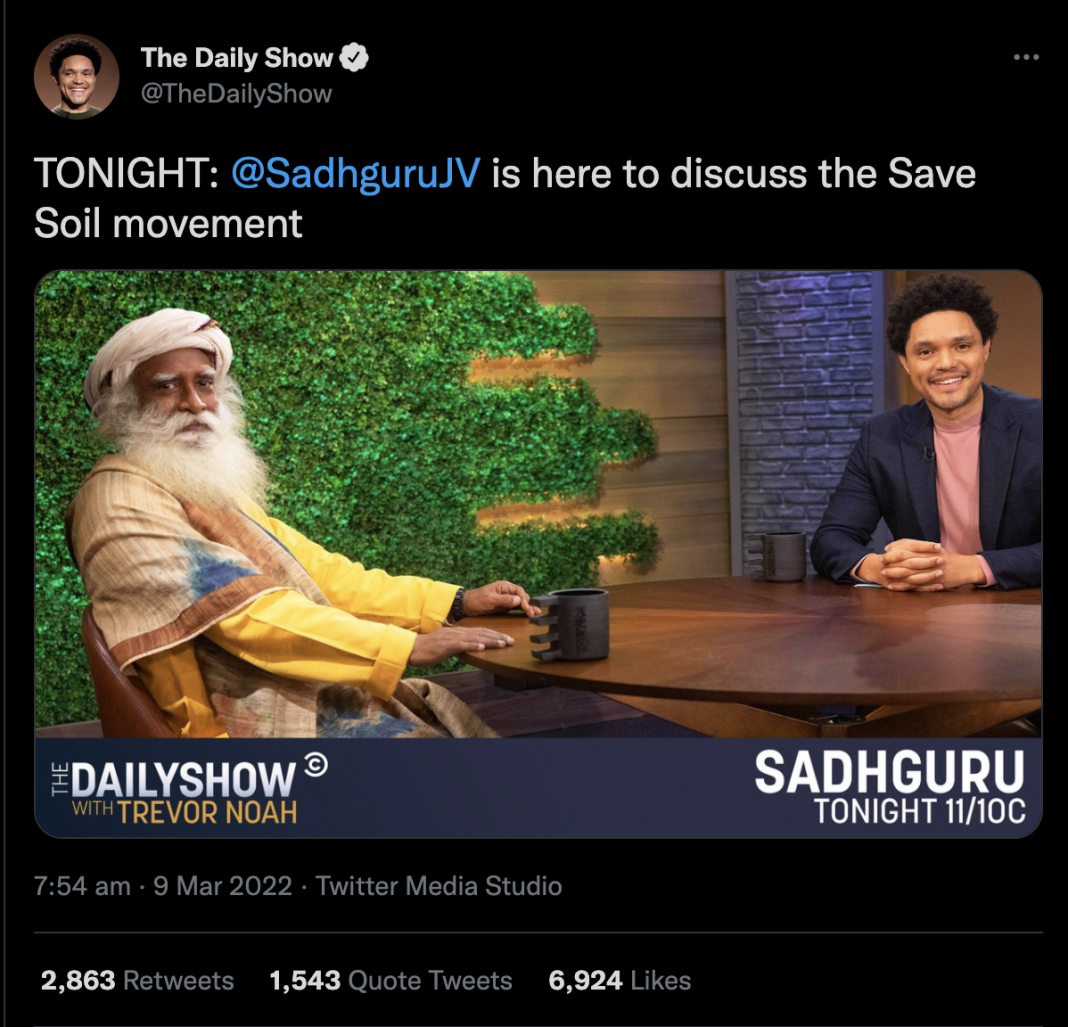 In a tweet, Trevor Noah said, “TONIGHT: @SadhguruJV is here to discuss the Save Soil movement”. In the show, Sadhguru and Trevor Noah discussed the “Save Soil movement” and the need for combatting desertification, thus preserving the organic value of the soil.