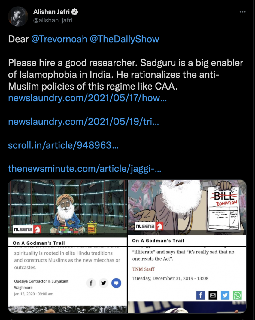 Alishan Jafri, an Islamic troll, attacked the show host Noah asking him to hire a good researcher. Peddling false propaganda against Sadhguru, Jafri claimed that the spiritual leader is a big enabler of Islamophobia in India.