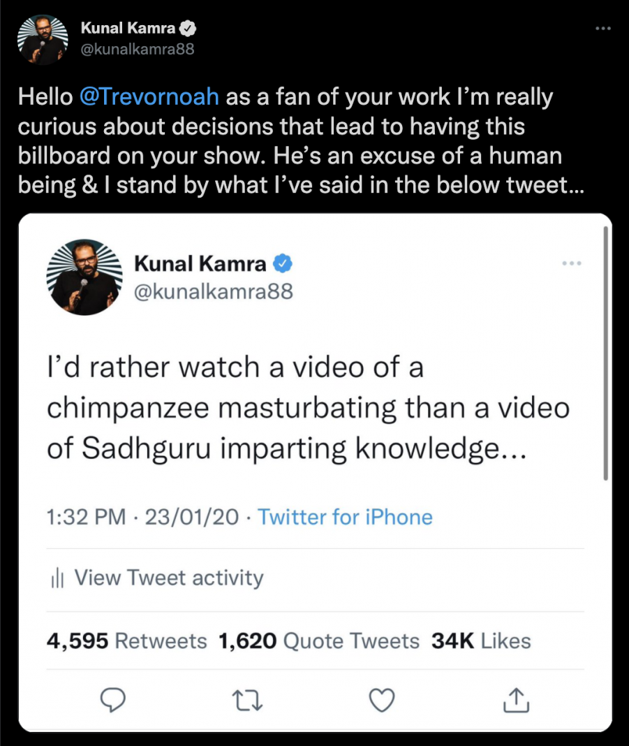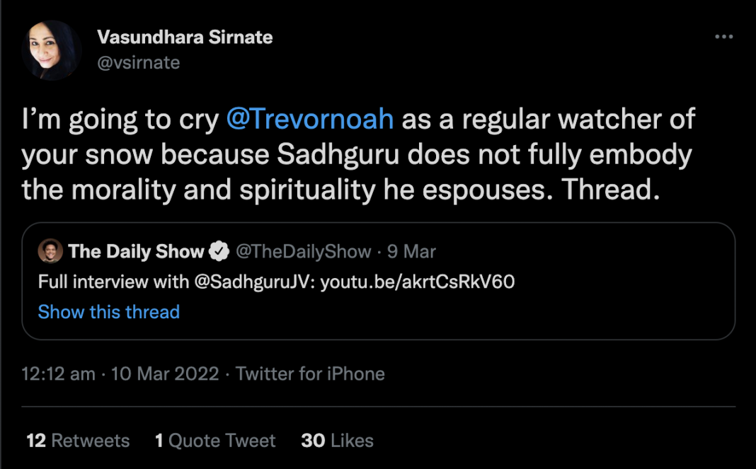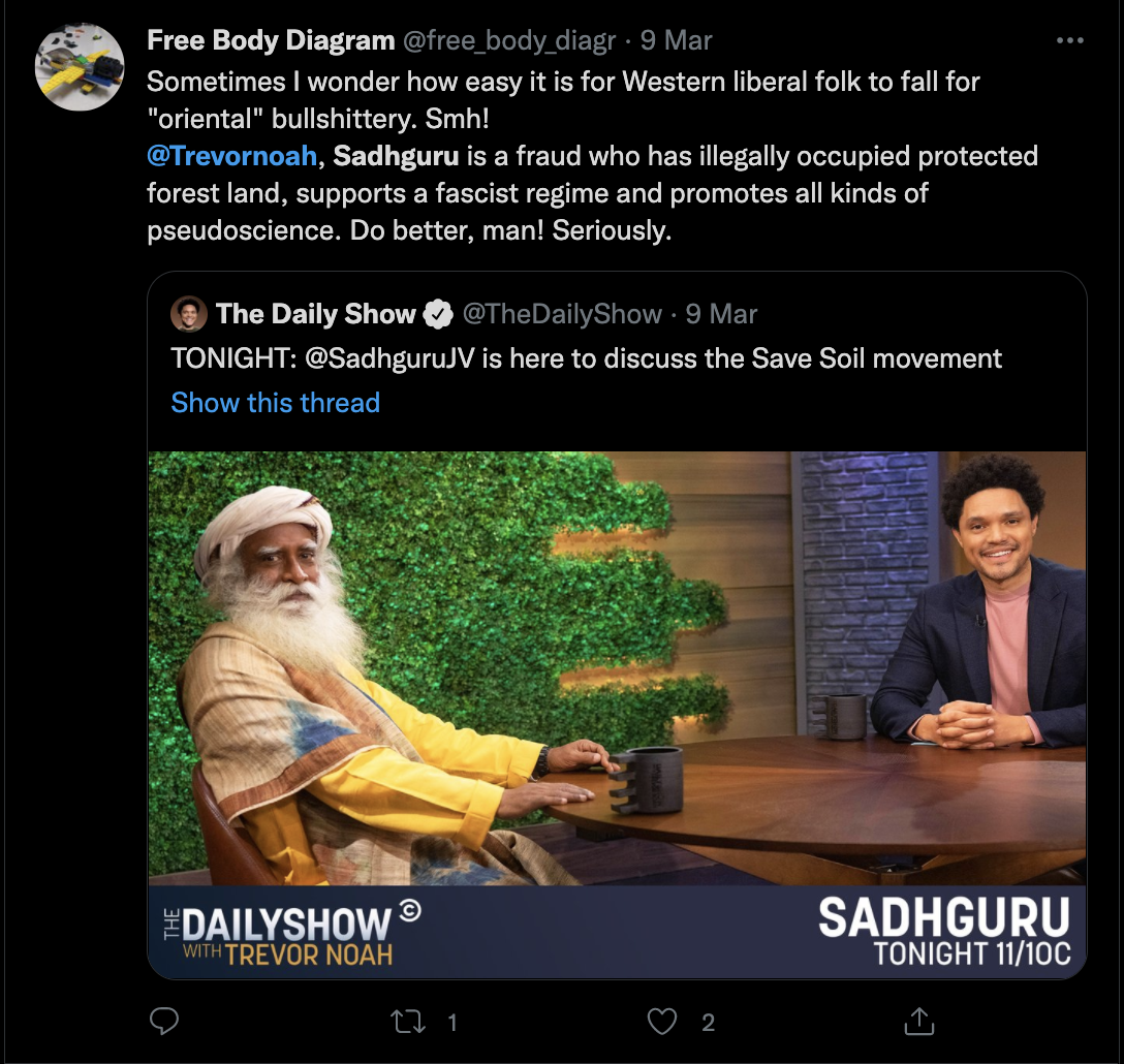 Another troll attacked and abused Trevor Noah, saying that he wondered how western liberal folk like Noah fall for “oriental bullshittery”. Making wild allegations against Sadhguru, he claimed that the spiritual leader was a fraud, who had illegally occupied protected forest land, supported a fascist regime and promoted all kinds of pseudoscience.