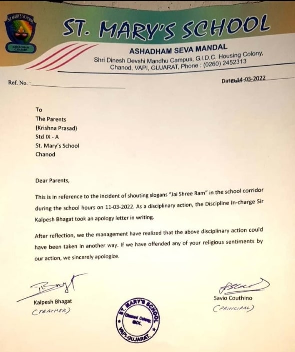 “This is in reference to the incident of shouting slogans “Jai Shree Ram” in the school corridor during the school hours on 11-03-2022. As a disciplinary action, the Discipline In-charge Sir Kalpesh Bhagat took an apology letter in writing,” the school said in a statement.