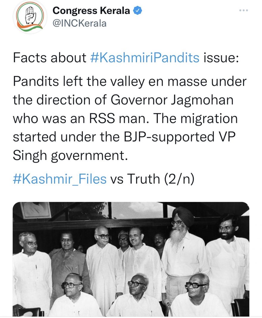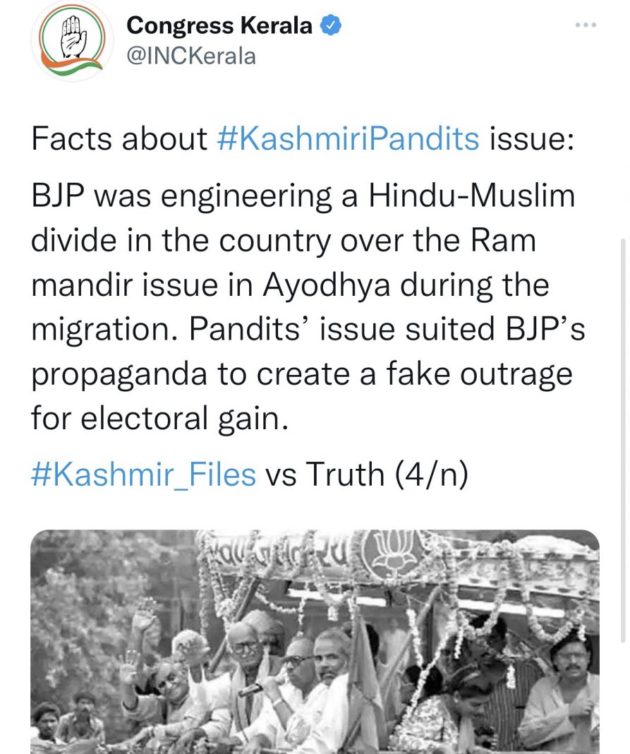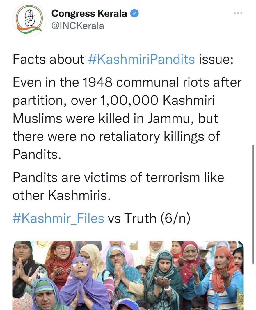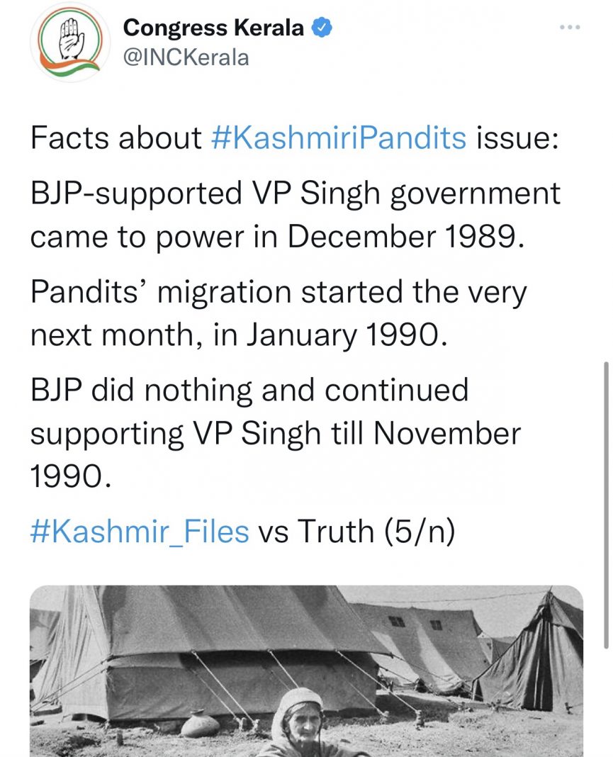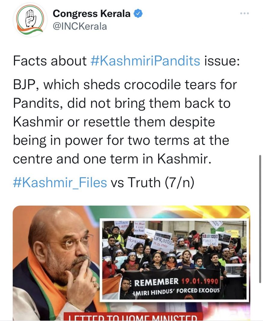 In a Twitter thread from their official Congress Kerala handle, the Congress party started off their rant by downplaying the whole Kashmiri Hindu genocide itself. Saying 399 Kashmiri Hindus were killed by terrorists, and comparing it to the 15,000 deaths of Muslims in the valley over the last 3 decades as a result of terrorism.
