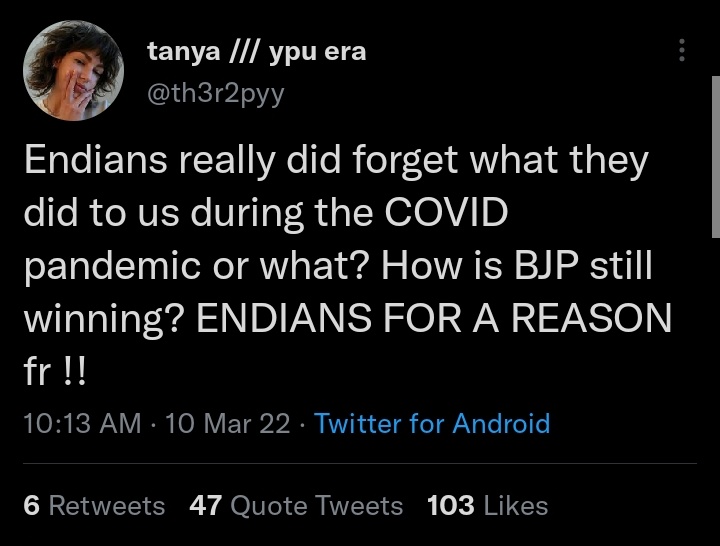 Tanya, picking up the Pakistan lingo of referring to India as ‘Endia’, cried on Twitter by saying that the ‘Endians’ forgot what they did to them during the Covid-19 pandemic. She asked how is BJP was still winning.
