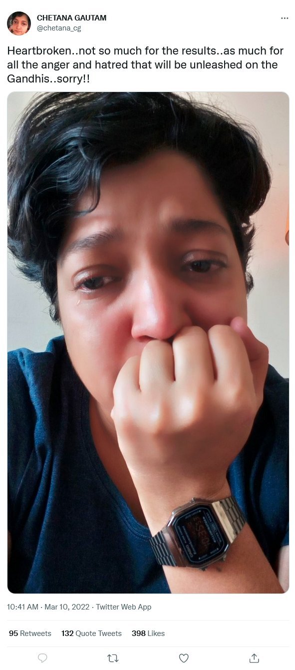 Another user Chethana Gautam was not only heartbroken, but she wanted to display it on Twitter. So, she posted an image of herself crying after the BJP won the historic elections. As per Congress supporter Chethana Gautam, who was visibly sad, she was sad as anger and hatred will be directed against the Gandhis.