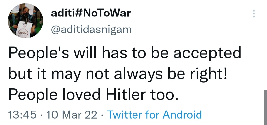 Another social media user Aditi said the will of people has to be accepted, but according to her, it may not always be right. People loved Hitler, too, shared Aditi, an anti-war activist.