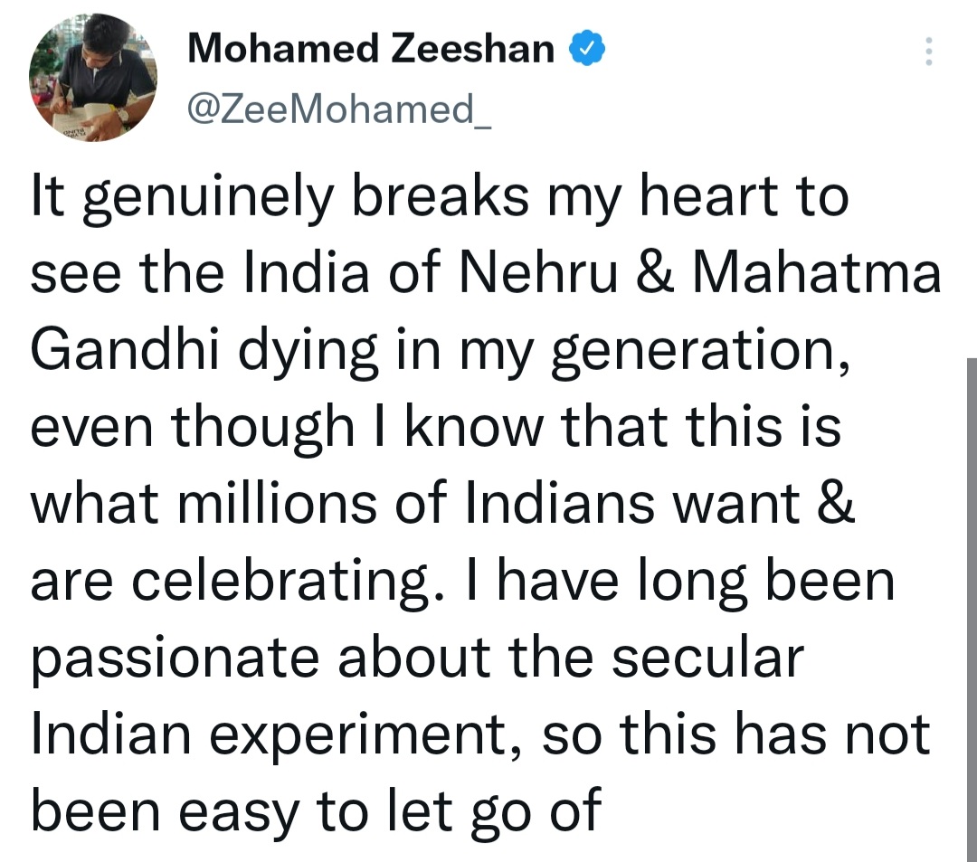 A social media user Mohammed Zeeshan, who often pretends to be an intellectual, lamented that it broke his heart to see the India of Nehru and Mahatma Gandhi dying in his generation, even though he knew that the election results are what millions of Indians wanted and celebrated.