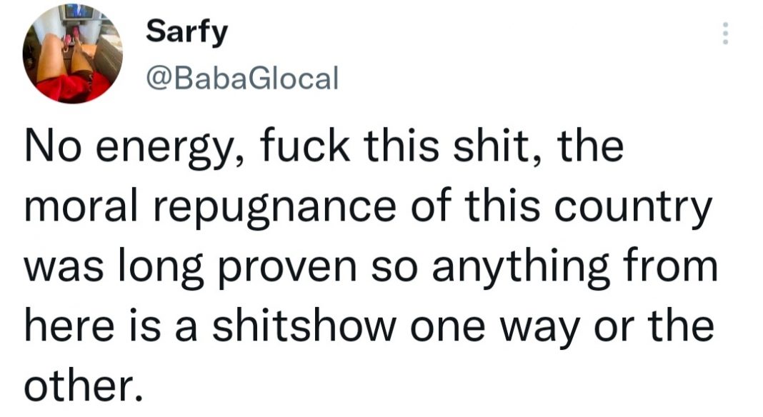 Sarfy, a face-less troll on Twitter, was too unhappy about BJP’s victory in the recently concluded elections. The social media user claimed that the BJP’s victory was nothing but a moral repugnance of the country, which was long proven. Hence, anything or event in the country was a sh*tshow one way or another.
