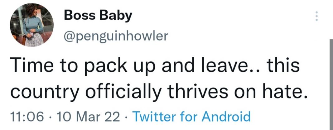 Boss Baby, another far-left troll, said that the country now officially thrived on hate, and it was time for her to pack up and leave the country.