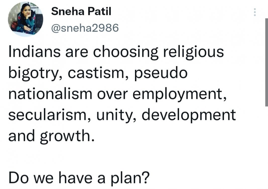 Sneha Patil, too suffered a meltdown following the humungous victory of the BJP in the assembly elections. As per Sneha, Indians are choosing religious bigotry, castism, pseudo nationalism over employment, secularism, unity, development and growth.